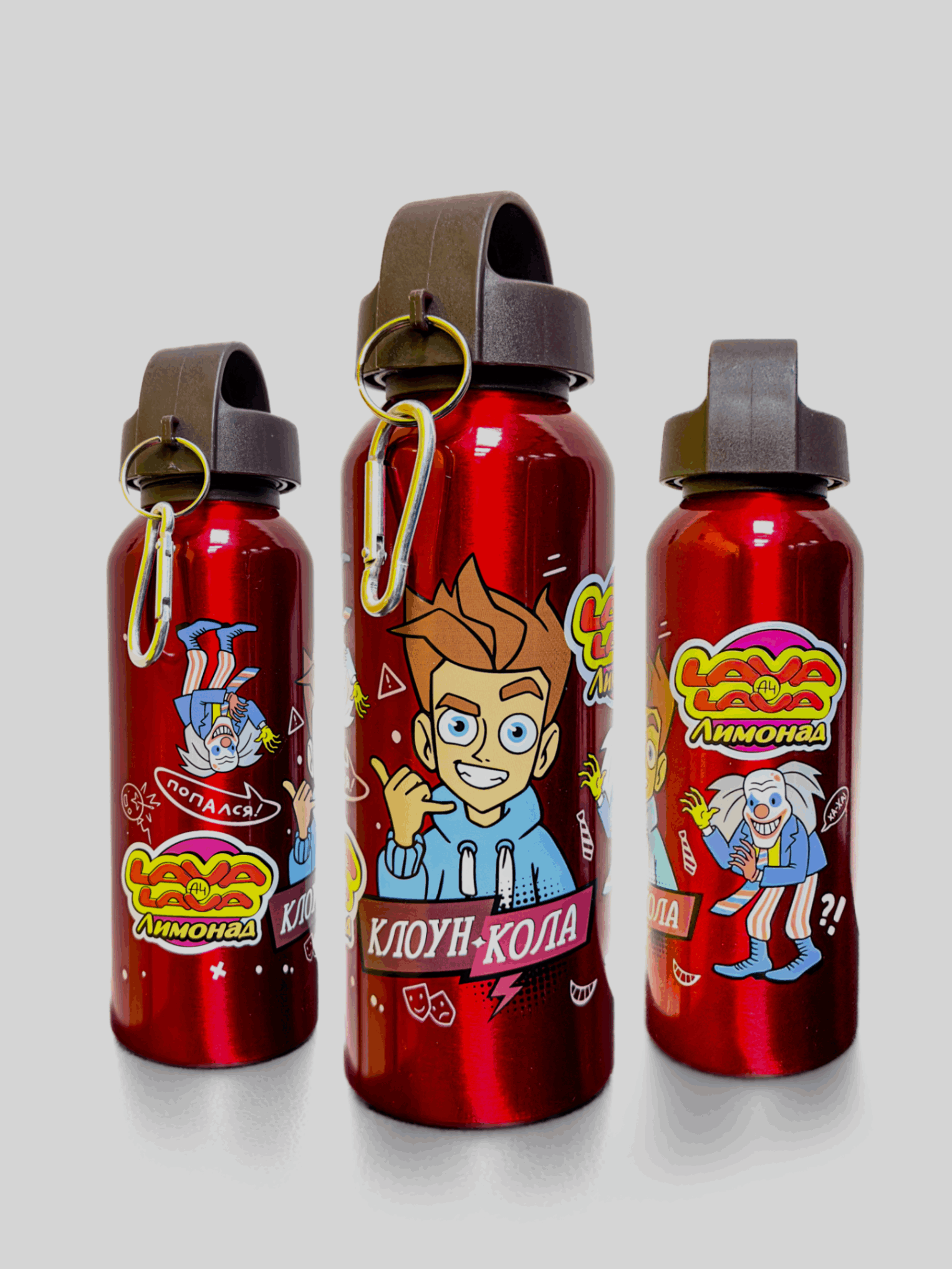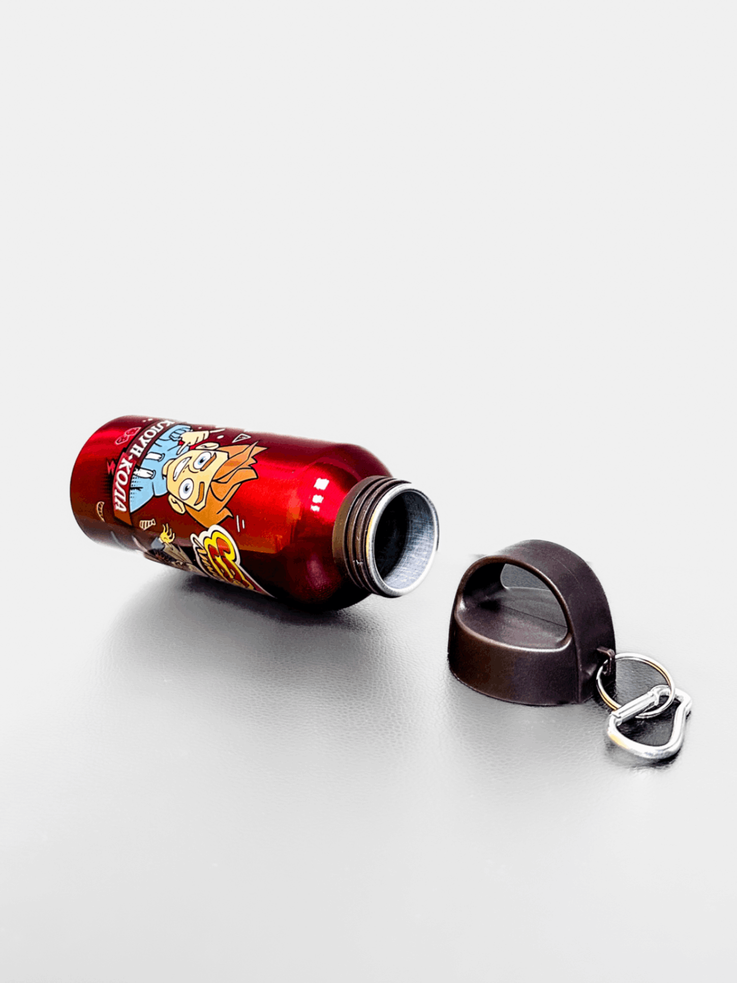 Бутылка для воды “Клоун-кола” объемом 500 мл. Герметичная крышка. Металлический карабин. Изготовлена из безопасных материалов: корпус из алюминия, крышка — из пищевого пластика.