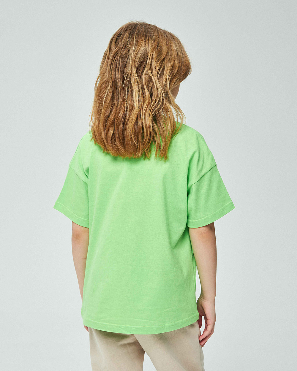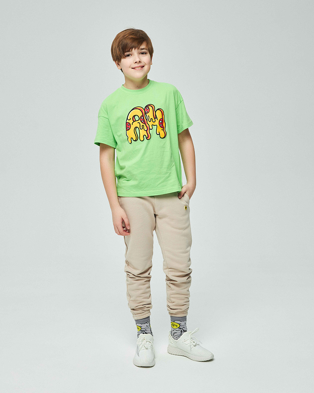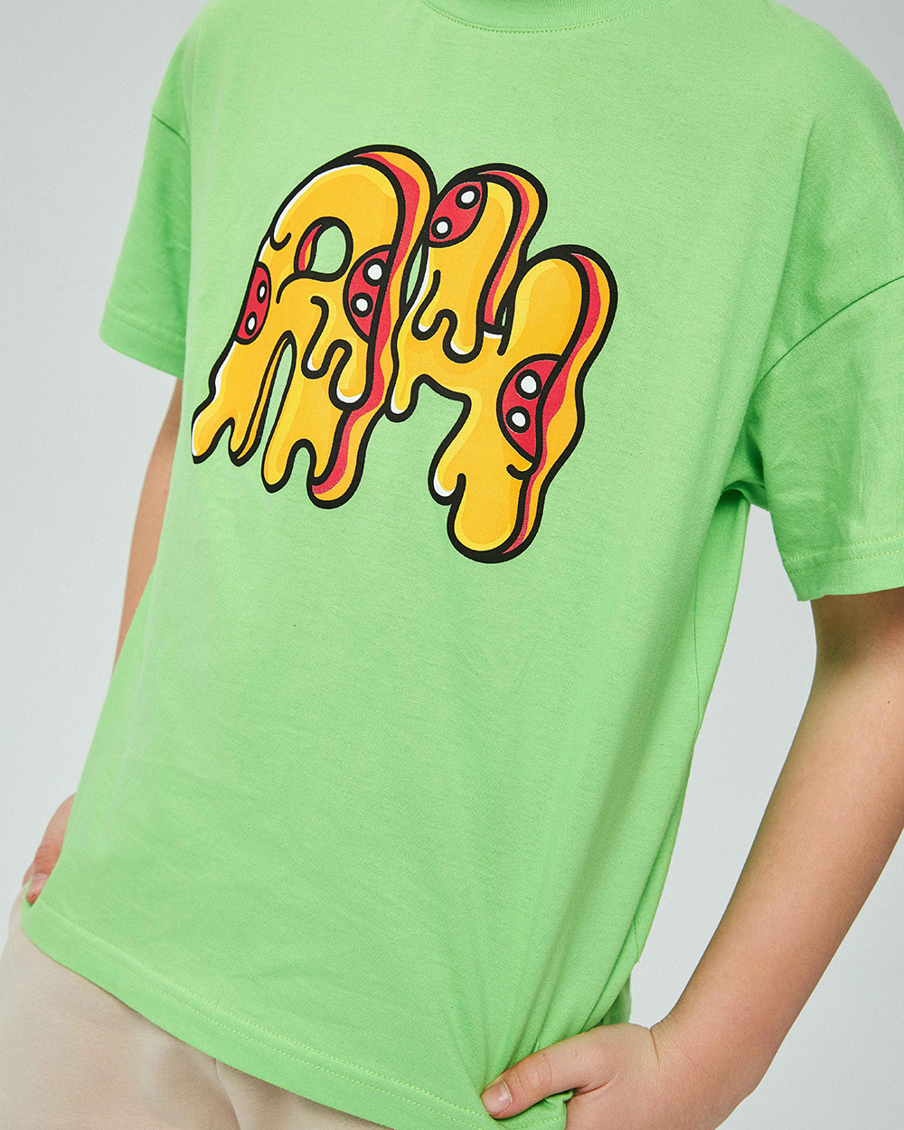 Зеленая футболка для мальчиков и девочек с принтом “Пицца A4” на груди. 100% хлопок. Комфортная оверсайз посадка.