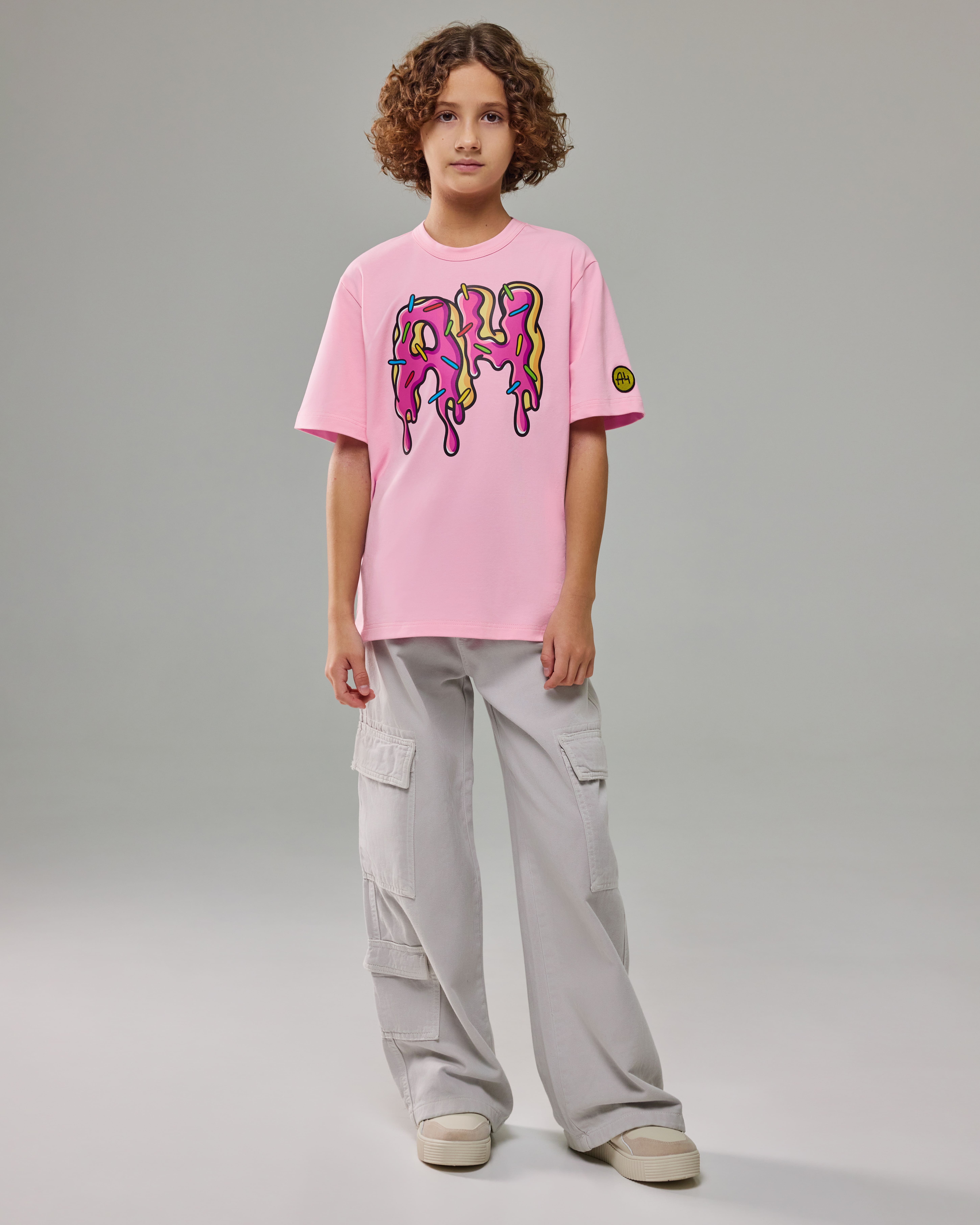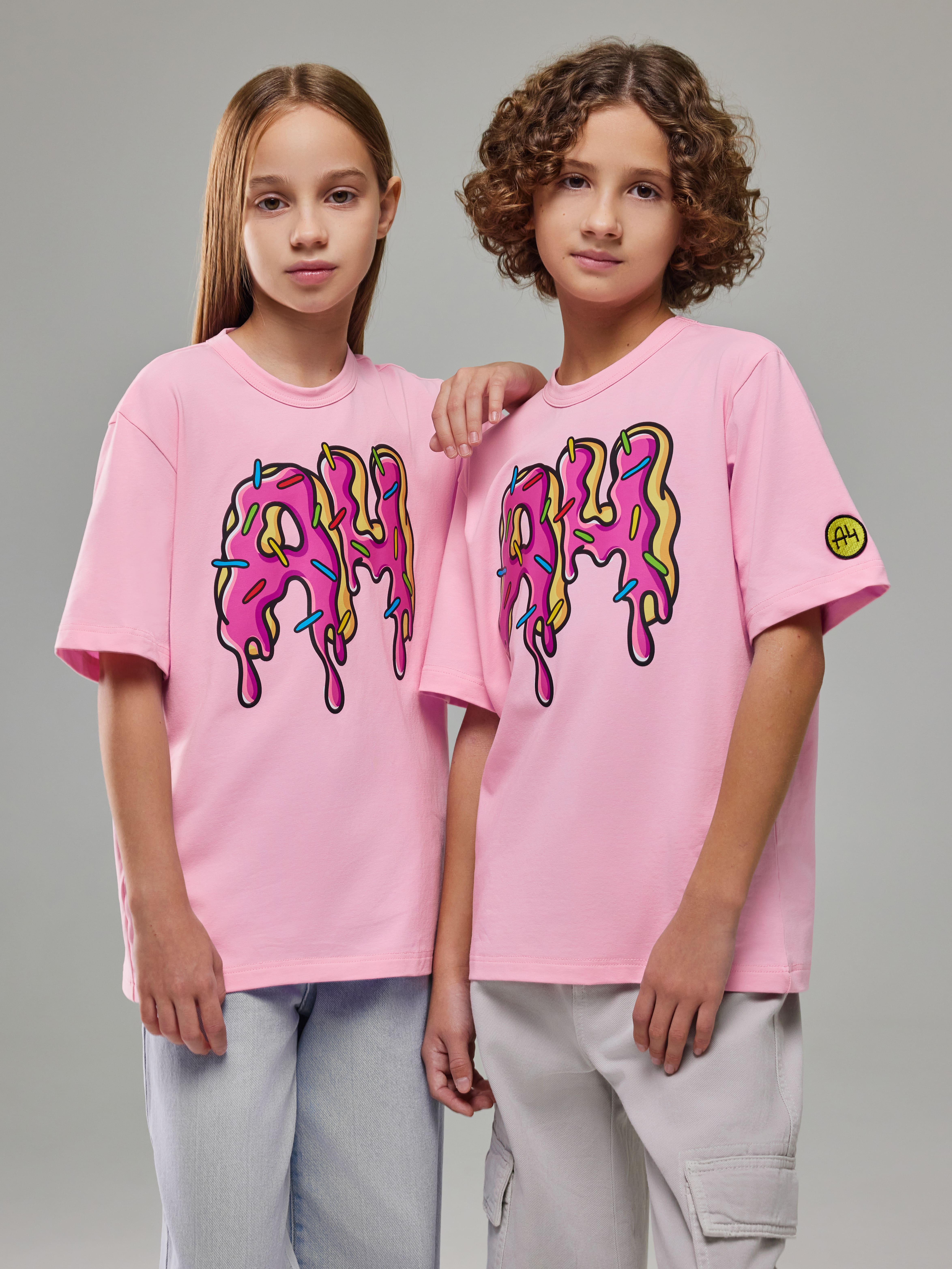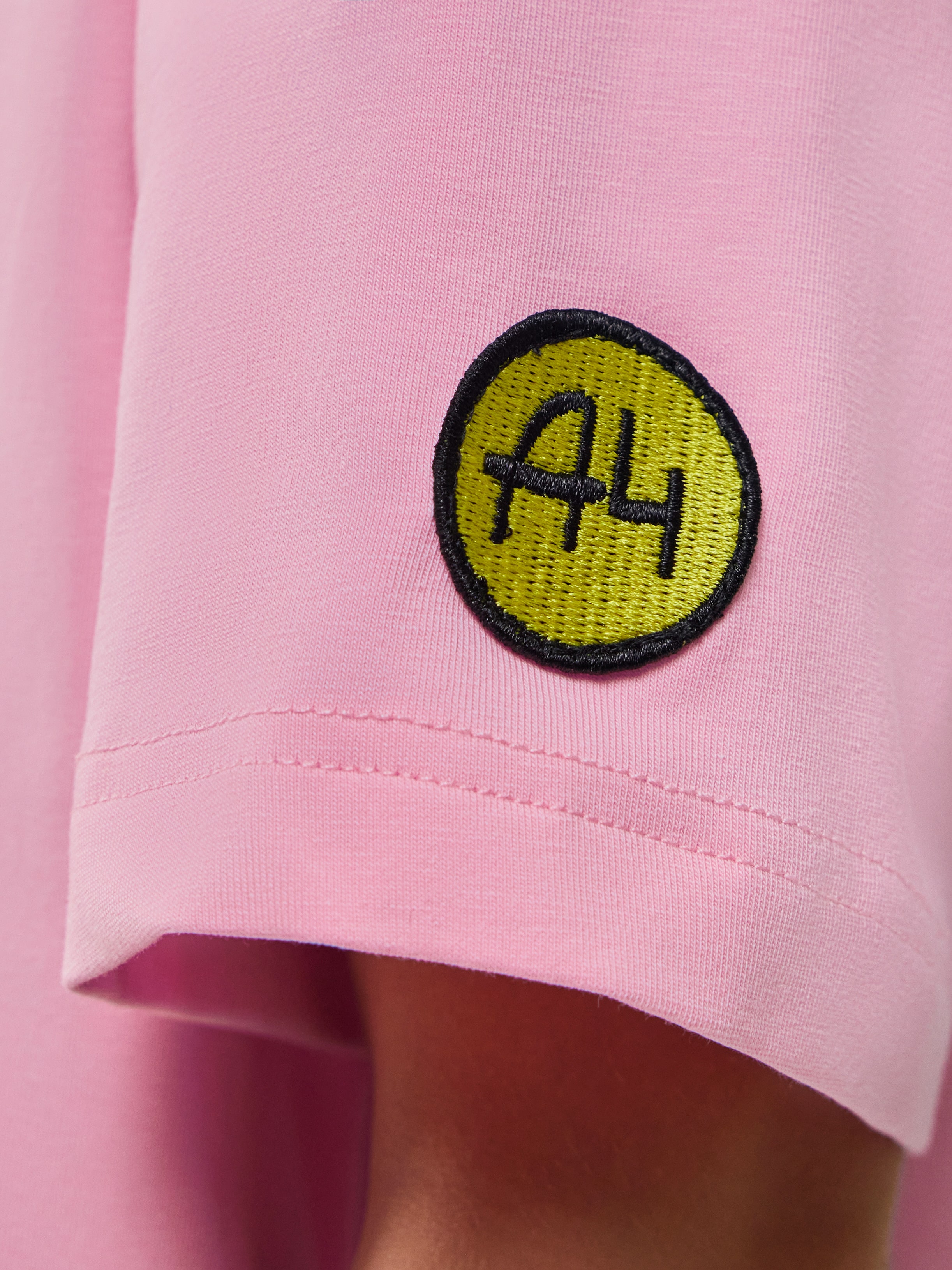 Розовая футболка для мальчиков и девочек с принтом “Пончик А4” на груди. Патч в виде логотипа А4 на левом рукаве. 92% хлопок, 8% эластан. Комфортная оверсайз посадка.