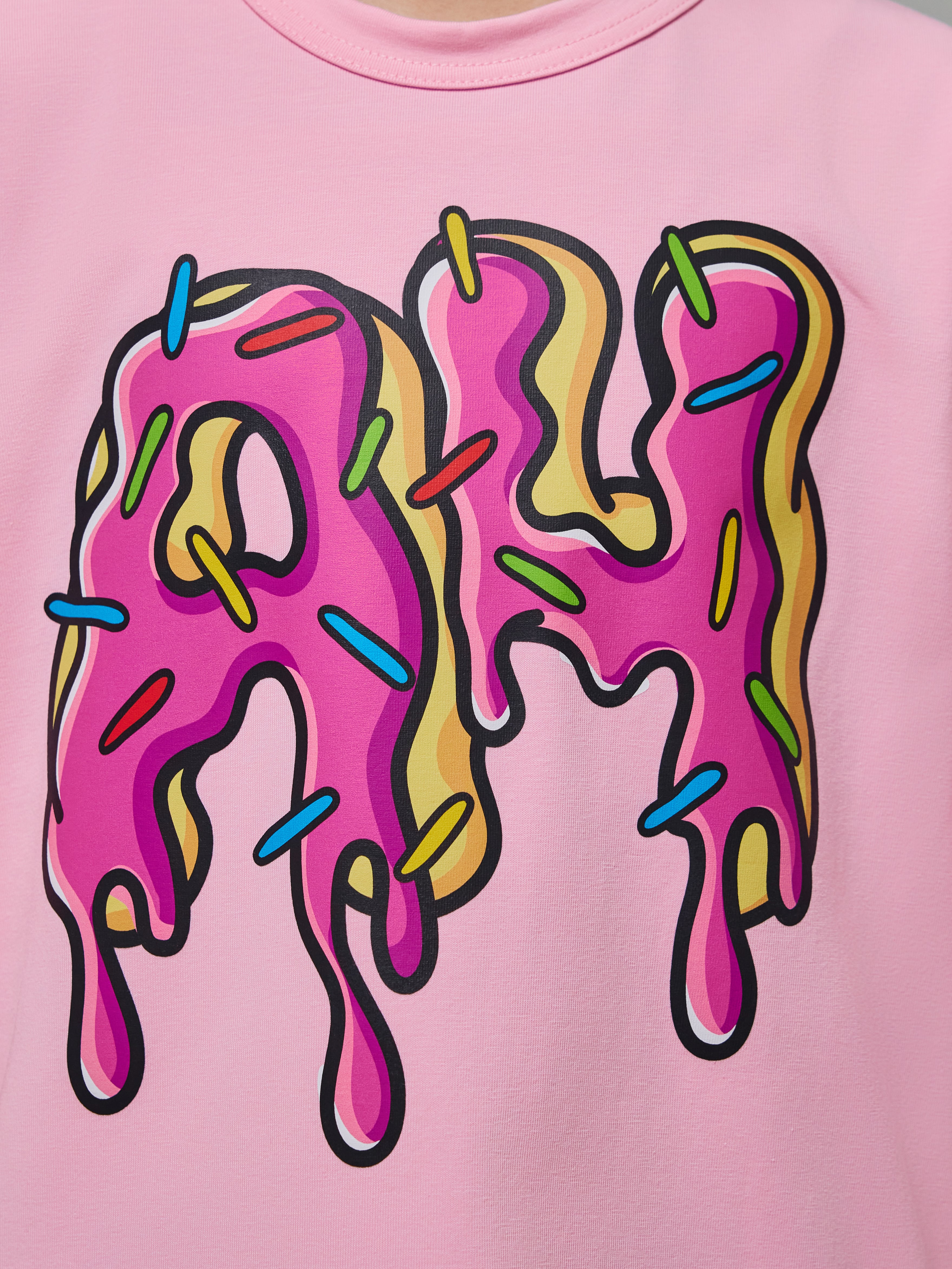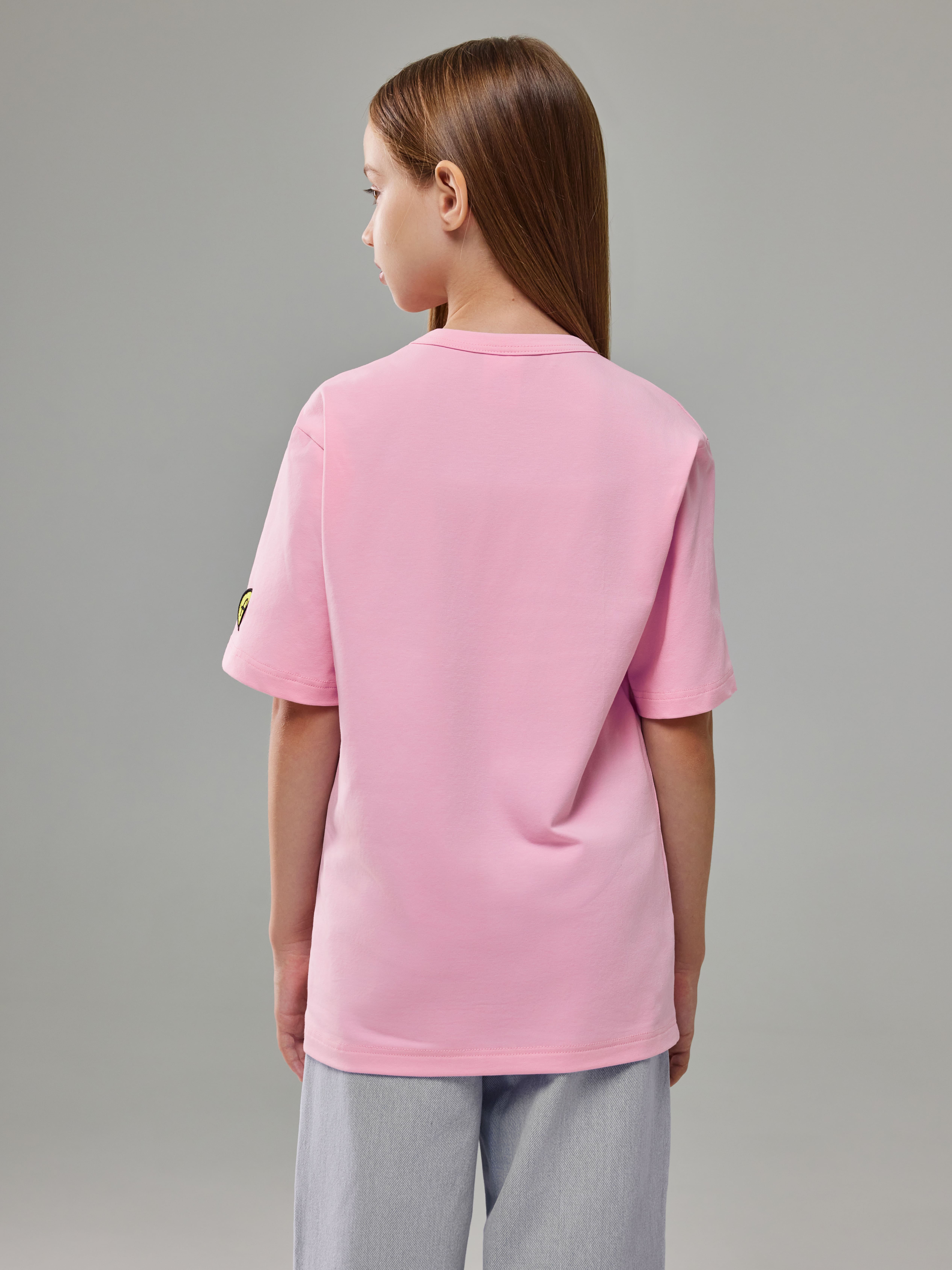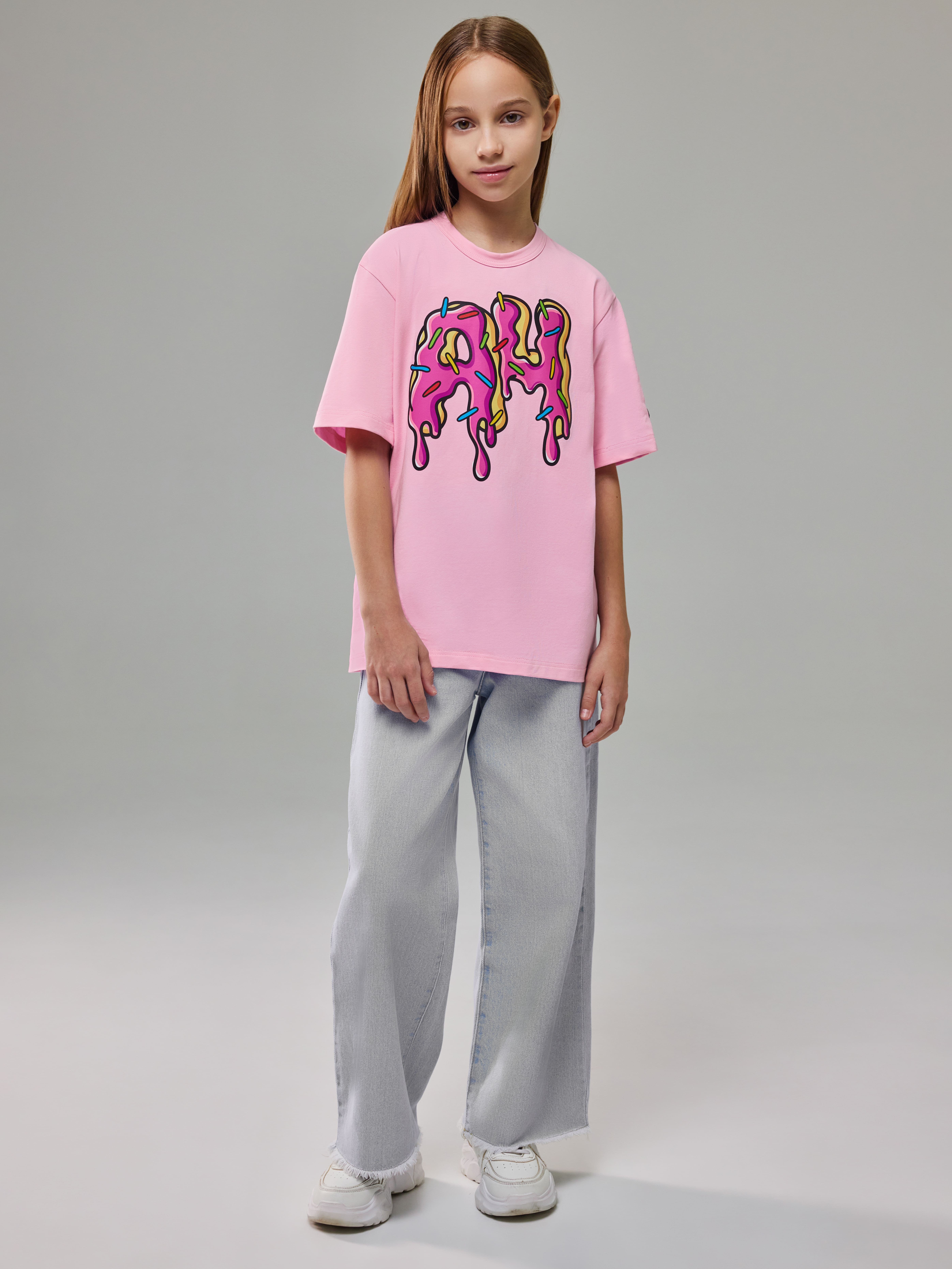 Розовая футболка для мальчиков и девочек с принтом “Пончик А4” на груди. Патч в виде логотипа А4 на левом рукаве. 92% хлопок, 8% эластан. Комфортная оверсайз посадка.