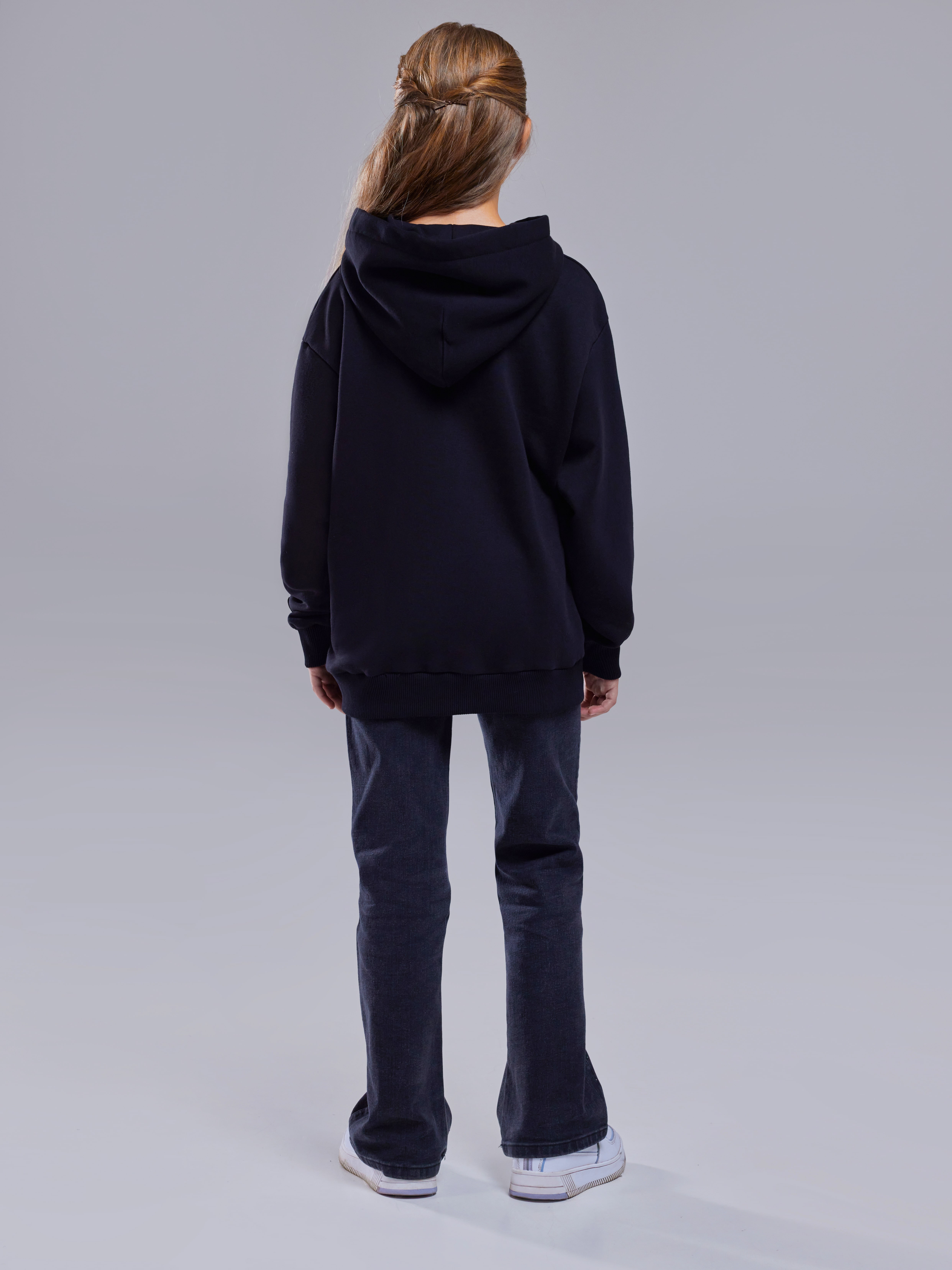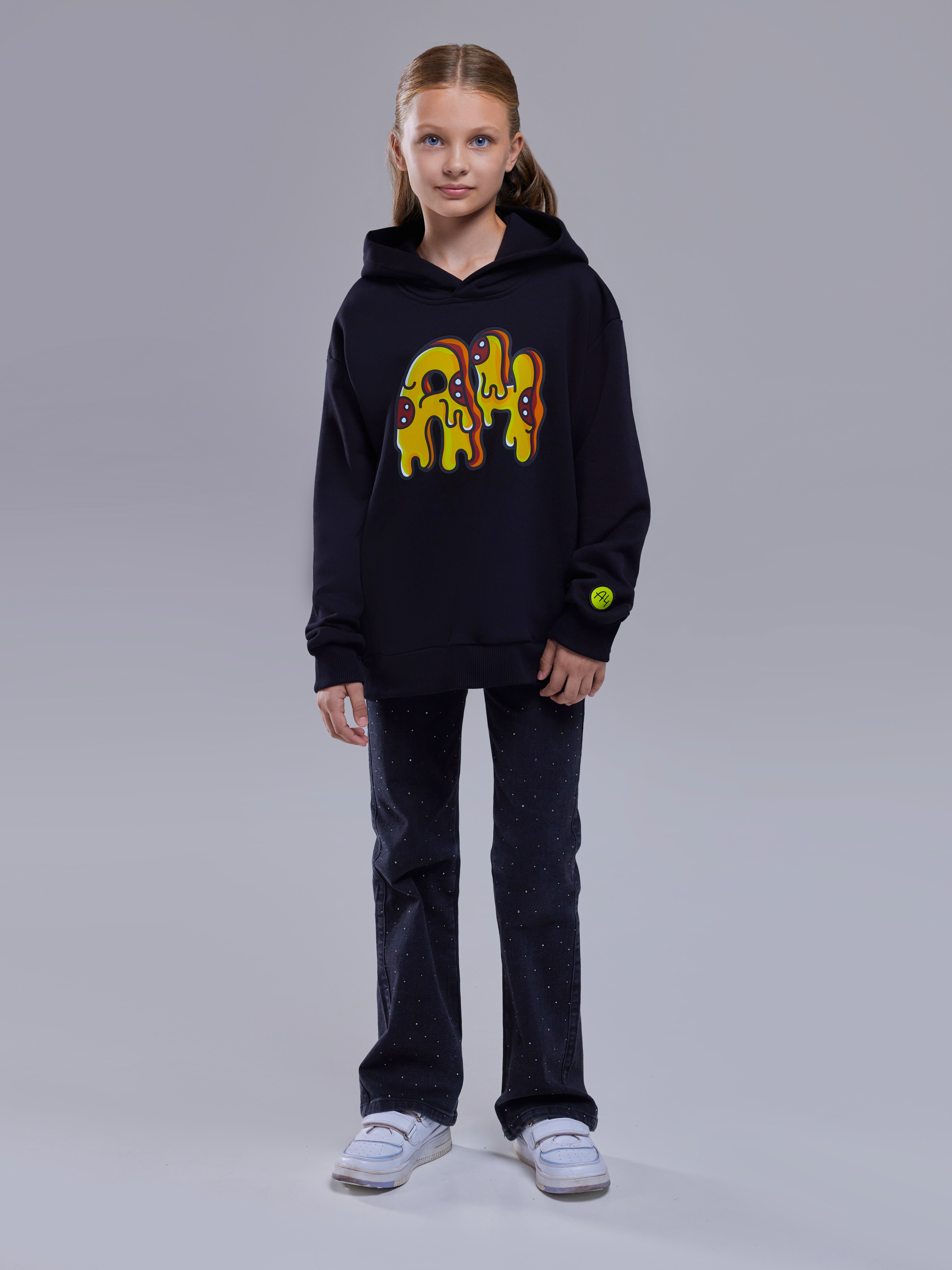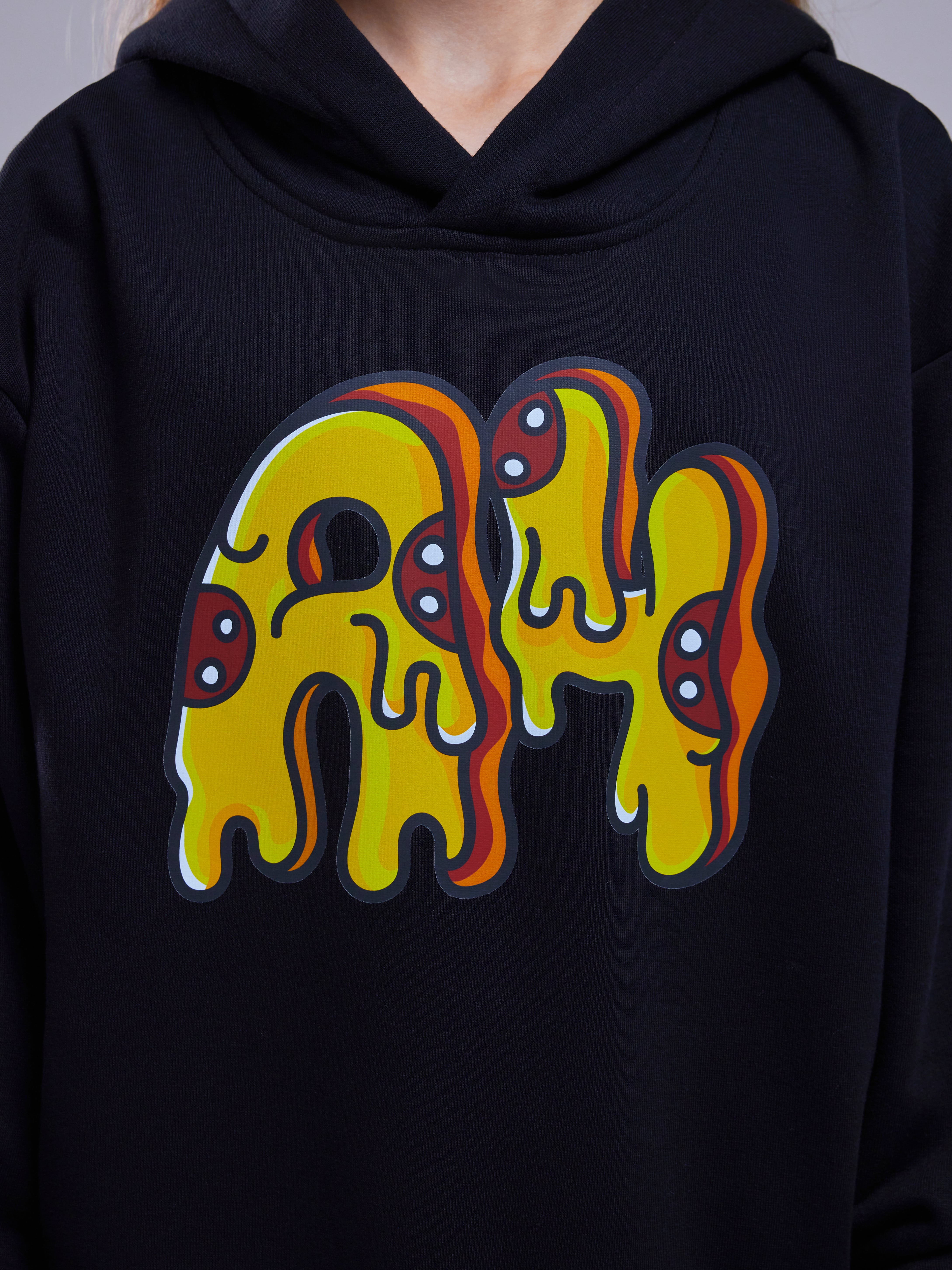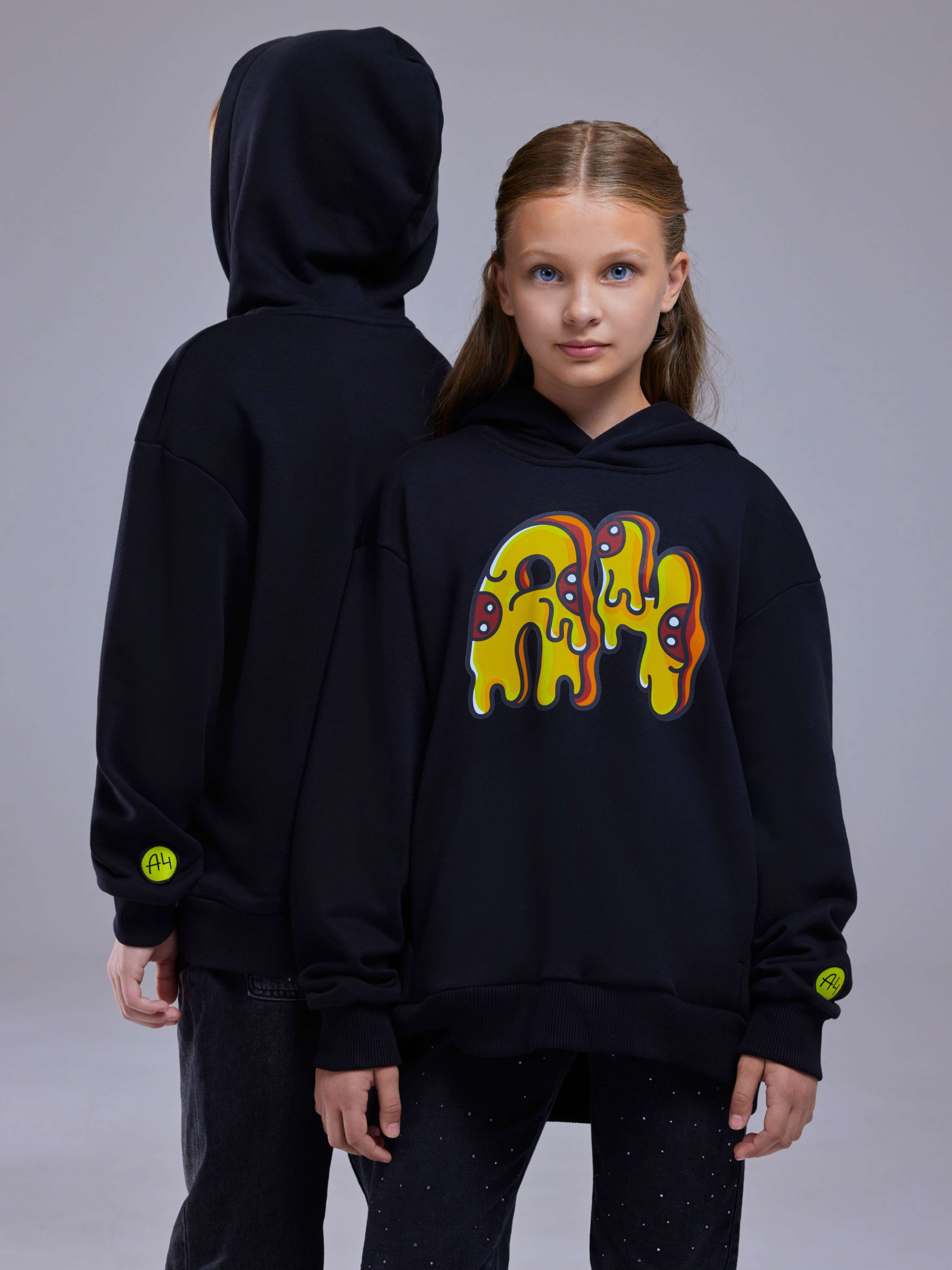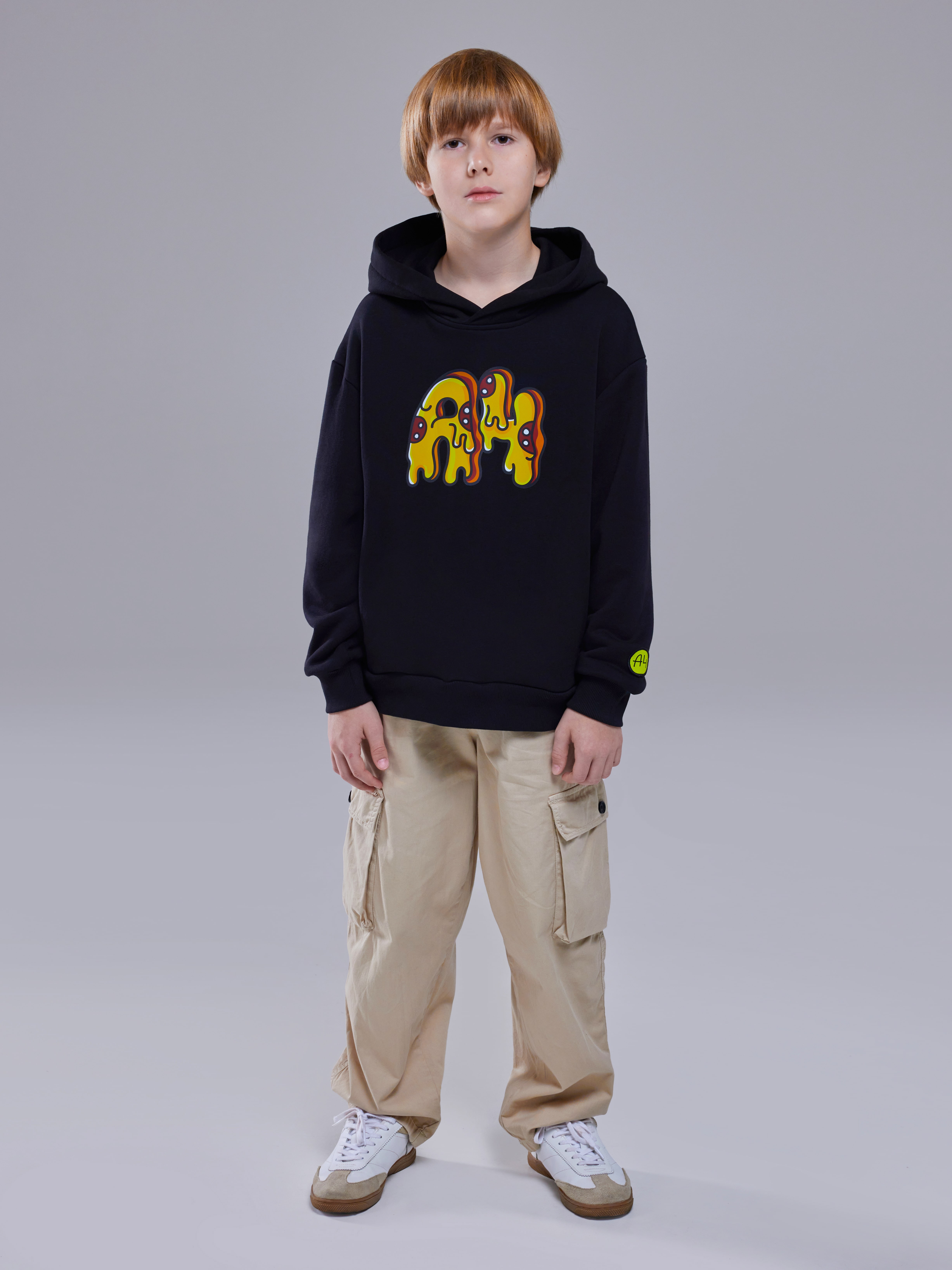 Черное худи для мальчиков и девочек с принтом “Пицца А4” на груди и капюшоном. Патч в виде логотипа А4 на левом рукаве. Длинные рукава с манжетами. Передние карманы. Футер 3-х нитка (80% хлопок, 20% полиэстер). Комфортная оверсайз посадка.