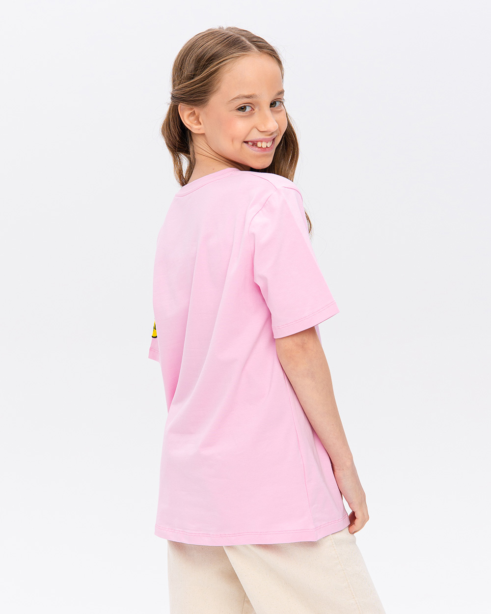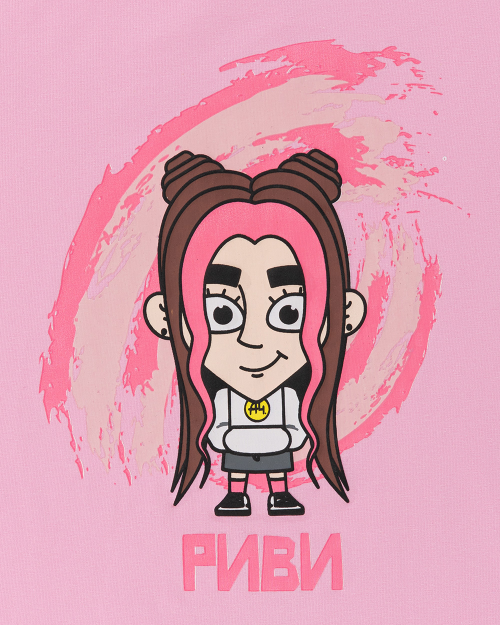 Розовая футболка для мальчиков и девочек с принтом “А4 RIVI PINK” на груди. Патч в виде логотипа А4 на левом рукаве. 95% хлопок, 5% эластан. Комфортная оверсайз посадка.